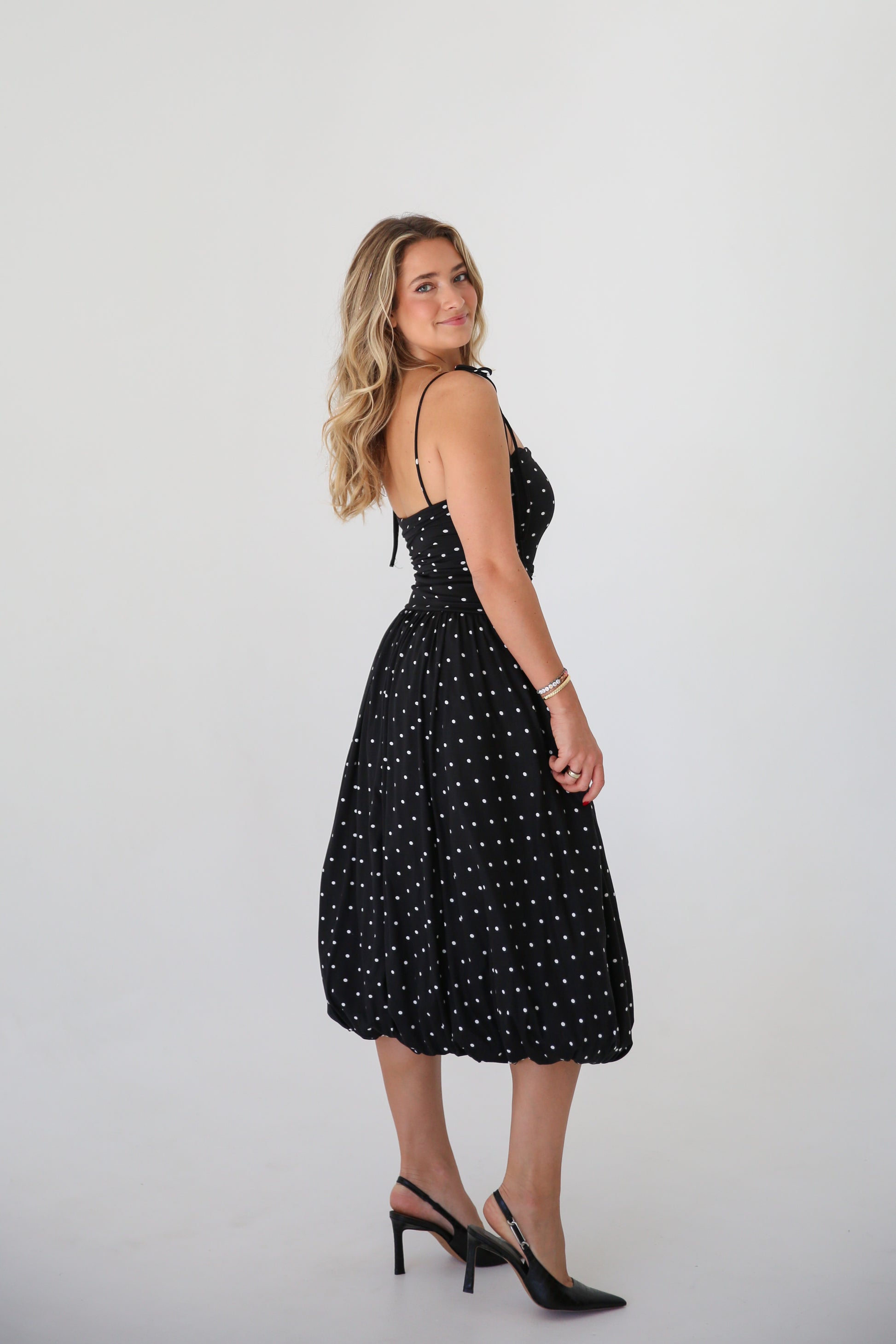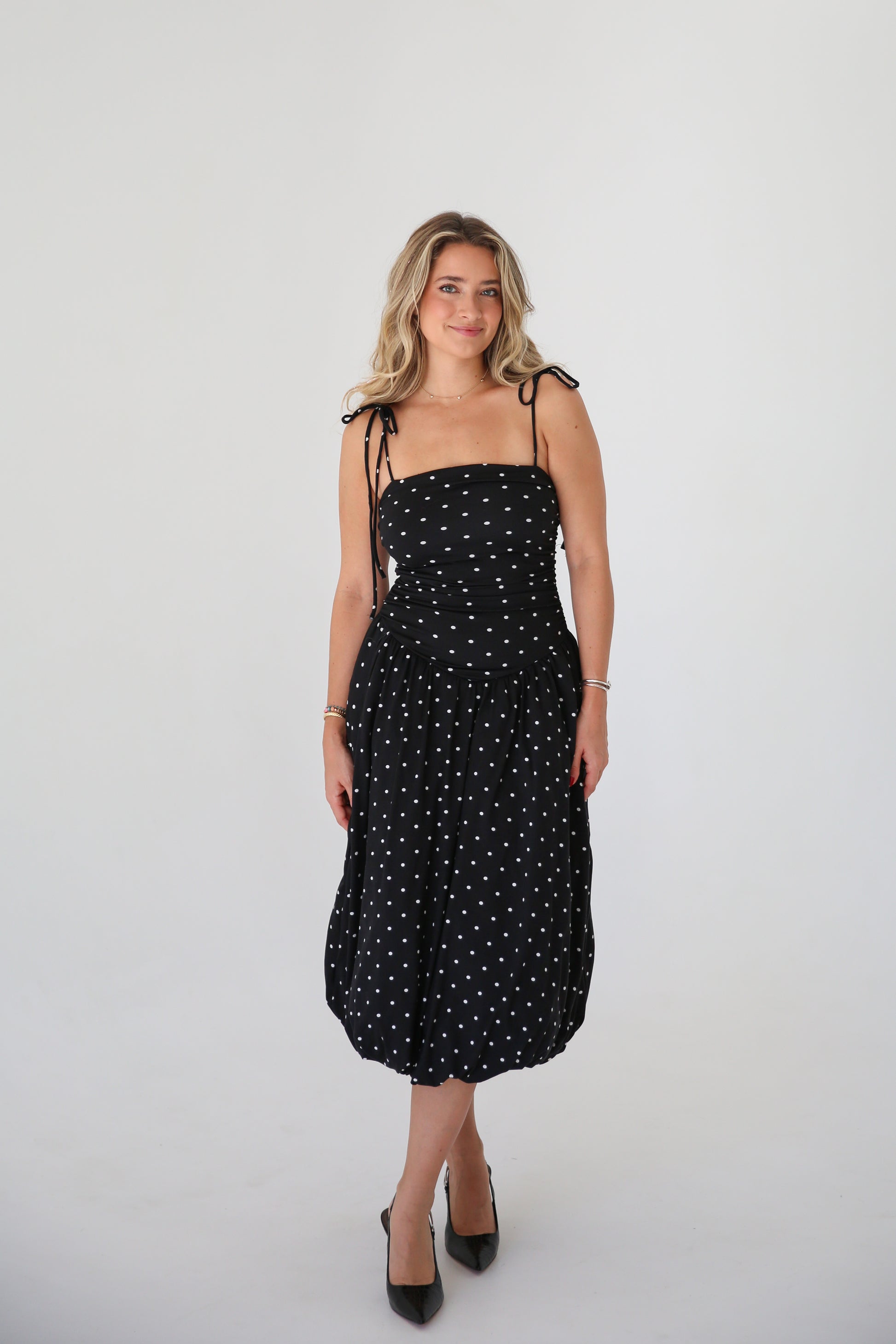 Indulge in elegance with our Ruched Drop Waist Dress. Featuring a sophisticated polka dot print and a flattering ruched drop waist, this midi bubble dress will make a statement at any event. The delicate spaghetti straps can be tied for a personalized fit. Elevate your wardrobe with this exclusive piece.