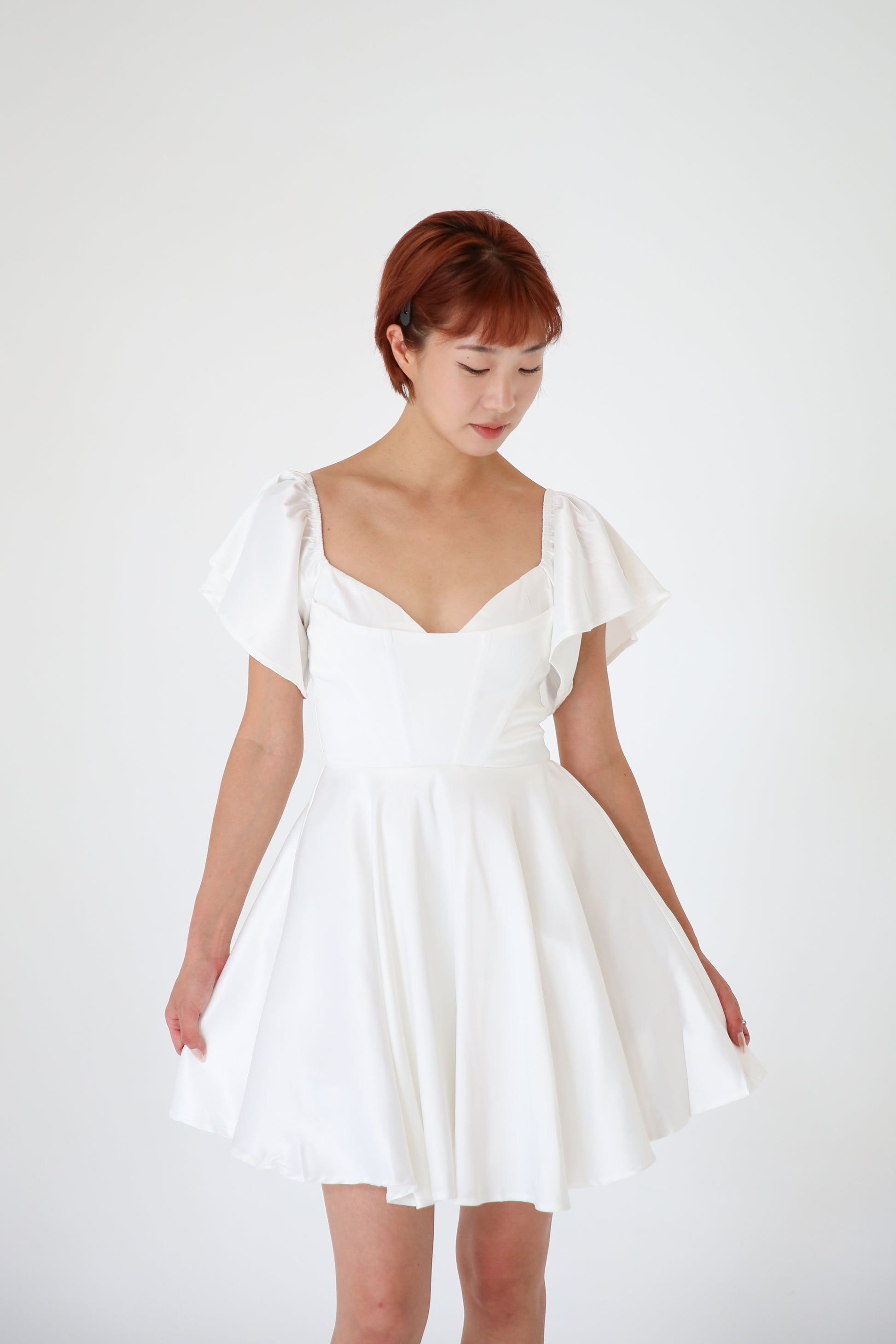 Look and feel beautiful in our Flared Babydoll Mini Dress. With flutter sleeves, flared hem, and invisible back zipper, this dress accentuates your curves while maintaining a feminine and romantic silhouette. Perfect for a bride at a wedding event or for everyday wear, this lined dress is a must-have in any wardrobe.