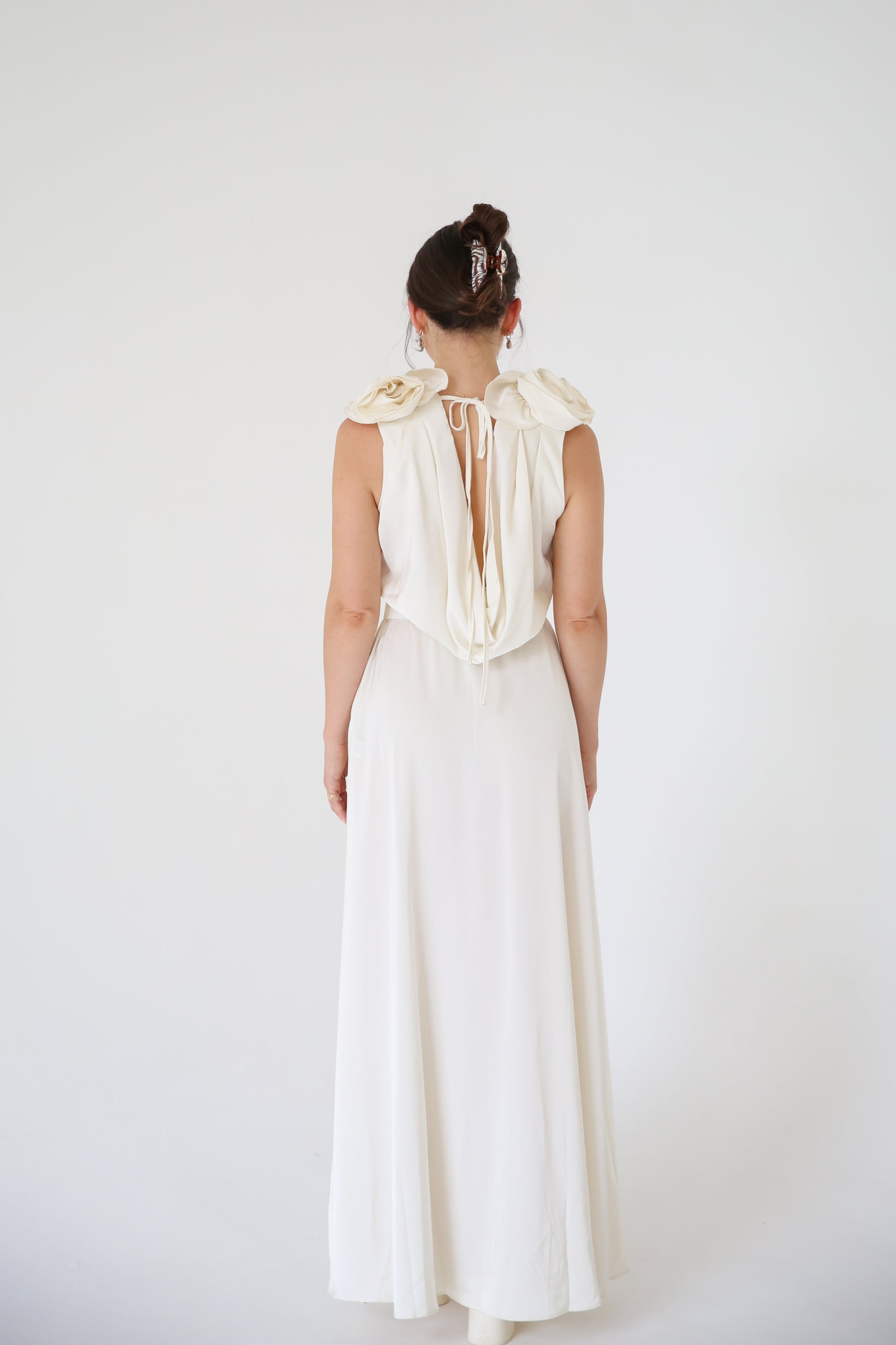 Indulge in the luxury of the Marlin Dress! This stunning maxi dress features a unique shoulder rosette, a plunging cowl neck, and silky satin fabric. Command attention at any event in this elegant piece.