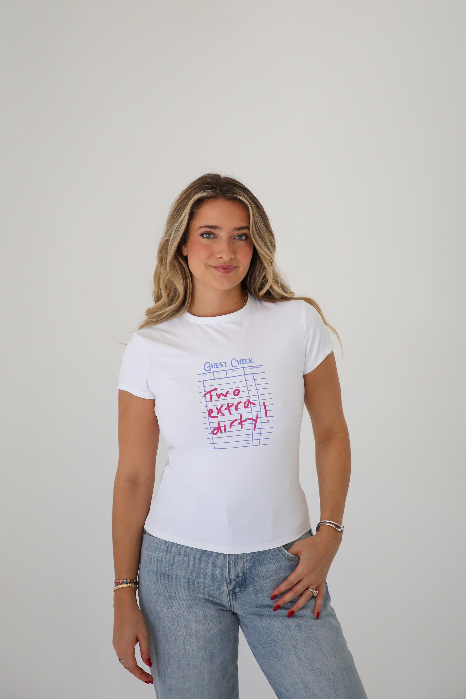 The Two Extra Dirty Baby Tee is a classic white tee perfect for any casual occasion.